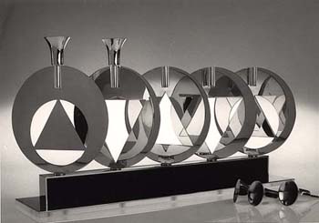 This is a multiple functional sculpture and an art piece to be displayed all year. As a Shabbat Menorah, the optional addition of the candle holders allows you to kindle as few as two and as many as eight candles. On Chanukah it transforms into a Chanukiah by adding the Shamash. The many parts rotate in different directions to form a never ending Star of David and as many different designs as your imagination leads you. See Graphic (0.5MB) |
