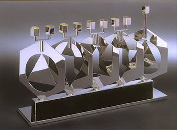 This is a multiple functional sculpture and an art piece to be displayed all year. As a Shabbat Menorah, the optional addition of the candle holders allows you to kindle as few as two and as many as eight candles. On Chanukah it transforms into a Chanukiah by adding the Shamash. The many parts rotate in different directions to form a never ending Star of David and as many different designs as your imagination leads you. See Graphic (0.5MB) |