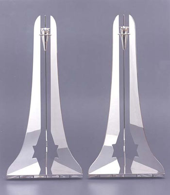 I have designed these Candlesticks to make a grand visual statement. This triangular shape tapering upward is in itself a powerful structure and gives your candles height even as they kindle low. The open space in the center traces the impression of the Star Of David. This open space together with the reflections from the high polished silver make a spectacular presentation on your Sabbath table. |