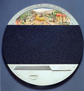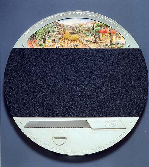This Challah Tray comes with a covered salt holder and knife engraved with the words Shabbat Shalom in Hebrew.The cutting surface is Corian and can easily be removed for cleaning. It is a new concept in functional Judaica, combining two different mediums in a unique way. The painting is an original Amalya Nini, specially commissioned for this piece. Each one is hand painted in watercolors on cotton paper and protected by a Plexiglas cover. I have chosen to express a typical Israeli landscape during the wheat harvest because of the words in the blessing of the bread; "HaMotzie Lechem Meen HaAretz". Engraved around the top is VeShimru; "And the children of Israel shall keep the Sabbath, to make the Sabbath an eternal covenant for their generations...". This Challah Tray comes with a Plexiglas stand to exhibit on. It will be a beautiful addition of "Hedur Mitzvah" to your Shabbat table and original art to enhance your home. See Graphic (0.8MB)