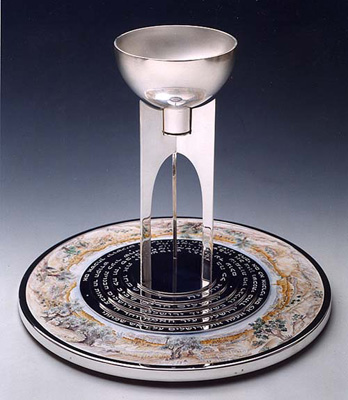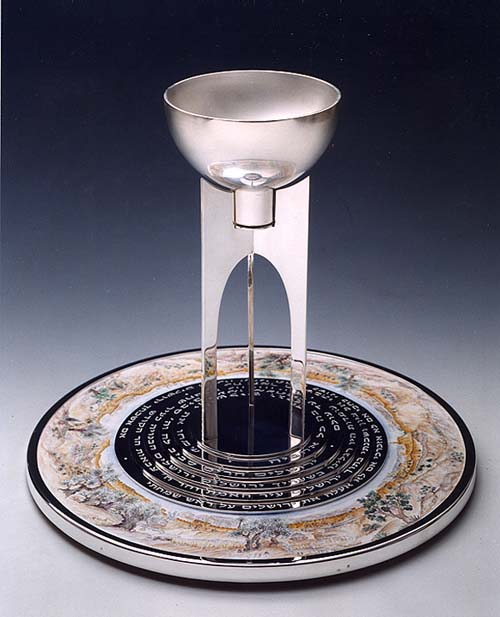 This design pays homage to Jerusalem and expresses her beauty, significance and holiness to the Jewish people. Around the base is an original watercolor painting of the walls and gates of the old city of David, the essential Jerusalem. There are six silver steps in the center, one representing each day of the week going up to the Kiddush Cup symbolizing the Sabbath. As we visually go up the steps, we see engraved on five of them verses from the Bible, accentuating the strength and significance of Jerusalem. The steps lead us to three legs that the Kiddush Cup rests upon, one for each of the three holidays we make Pilgrimage, Succott, Pesach and Shevuot. Engraved on the silver cover of the oil container is a passage from the Bible. The flame of the Aish Tamid is in the center at the highest point symbolizing the Beit Hamigdash, the essence of our love and yearning for Jerusalem.