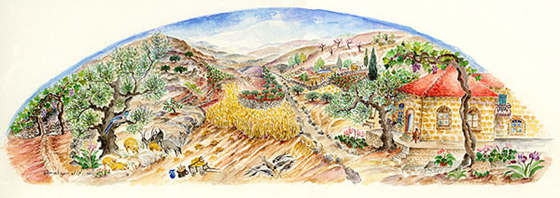 Painting for Challah Tray This painting is an Original Amalya Nini, one of Israels finest Judaic artists. Each painting is hand painted and commissioned specially for each Challah Tray. You can have your painting customized to be done in the colors or scenery of your liking.