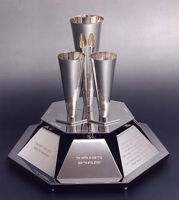 Hosting the Seuddat Mitzvah of the Sheva Brachot for a newly married couple is a great honor. For this Mitzvah I have designed this special piece for an exceptional Hiddur Mitzvah. The ceremony starts with the Zimmun, which is engraved around the plate of the three cups. On each side of the heptagon is engraved one of the seven blessings. Each blessing can be read from the main dish or they can be removed and placed directly in front of the person giving the blessing. There are three cups, two of the same size for the blessings and a third that is larger to combine the other two within it for the Chatan and Kallah. There is an additional plate for only two cups to be used for the ceremony under the Chuppah. In Jewish thought, the number seven denotes completion. The seven-sided shape of this design reflects the complete union of two people in marriage. See Graphic (0.2MB) |